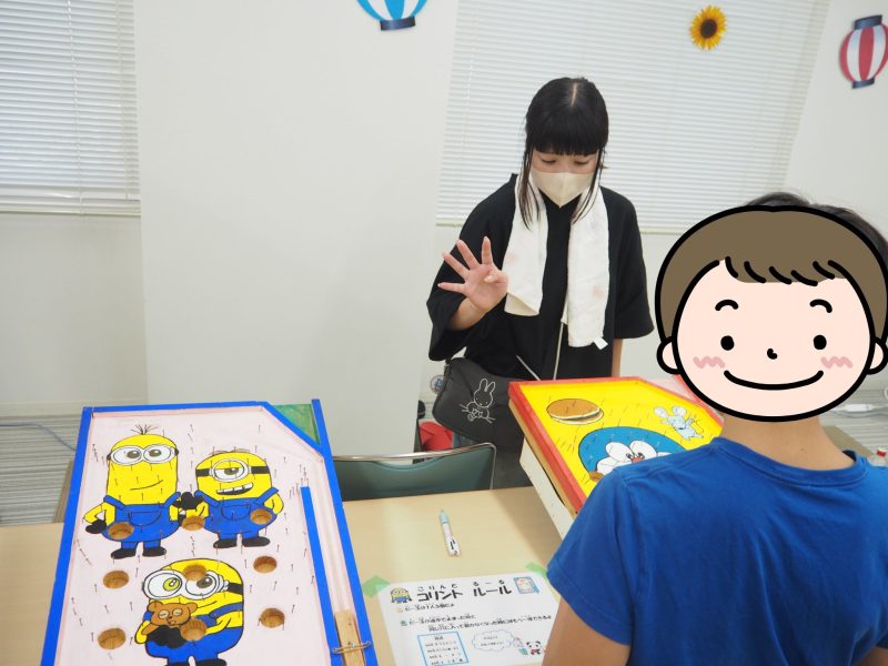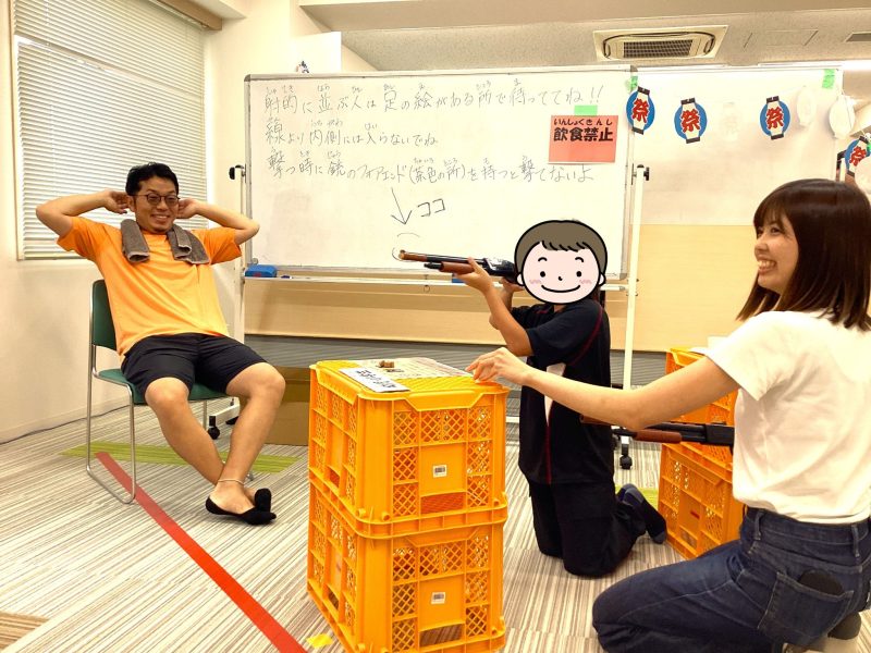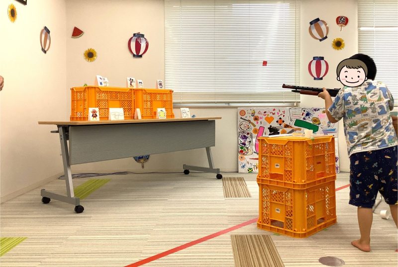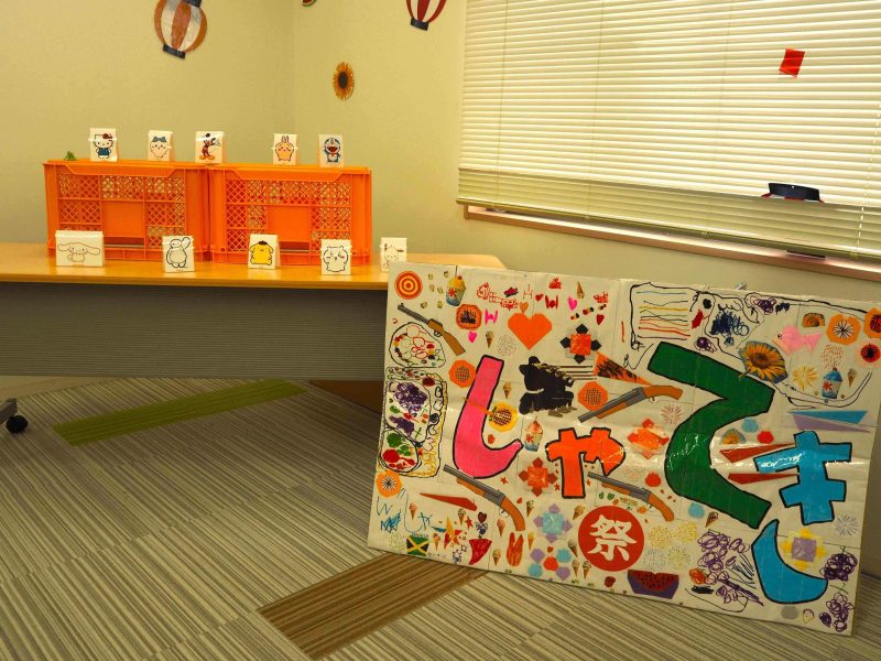射的では、的を何としてでも倒そうと集中力を如何なく発揮し何度もチャレンジする子どもたち。射的の的は職員が手作りし、看板は幼児ホームの子どもたちが自由に絵を描いて完成させてくれました! 子どもたちの想像力は無限大!!!