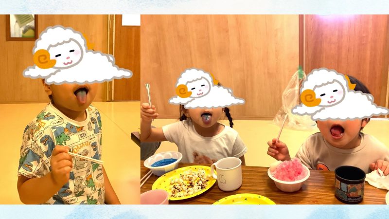 かき氷では、シロップで舌が赤くなったり、青くなったりする様に一喜一憂する子どもたち。