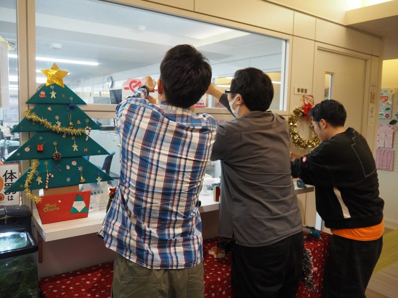 飾り付けの最中は、雑談したり、ちょっとしたおふざけがあったりと、笑い声が絶えない和気あいあいとした時間になりました。楽しみながら作業することで、私たち職員にとっても良い息抜きになりました。
